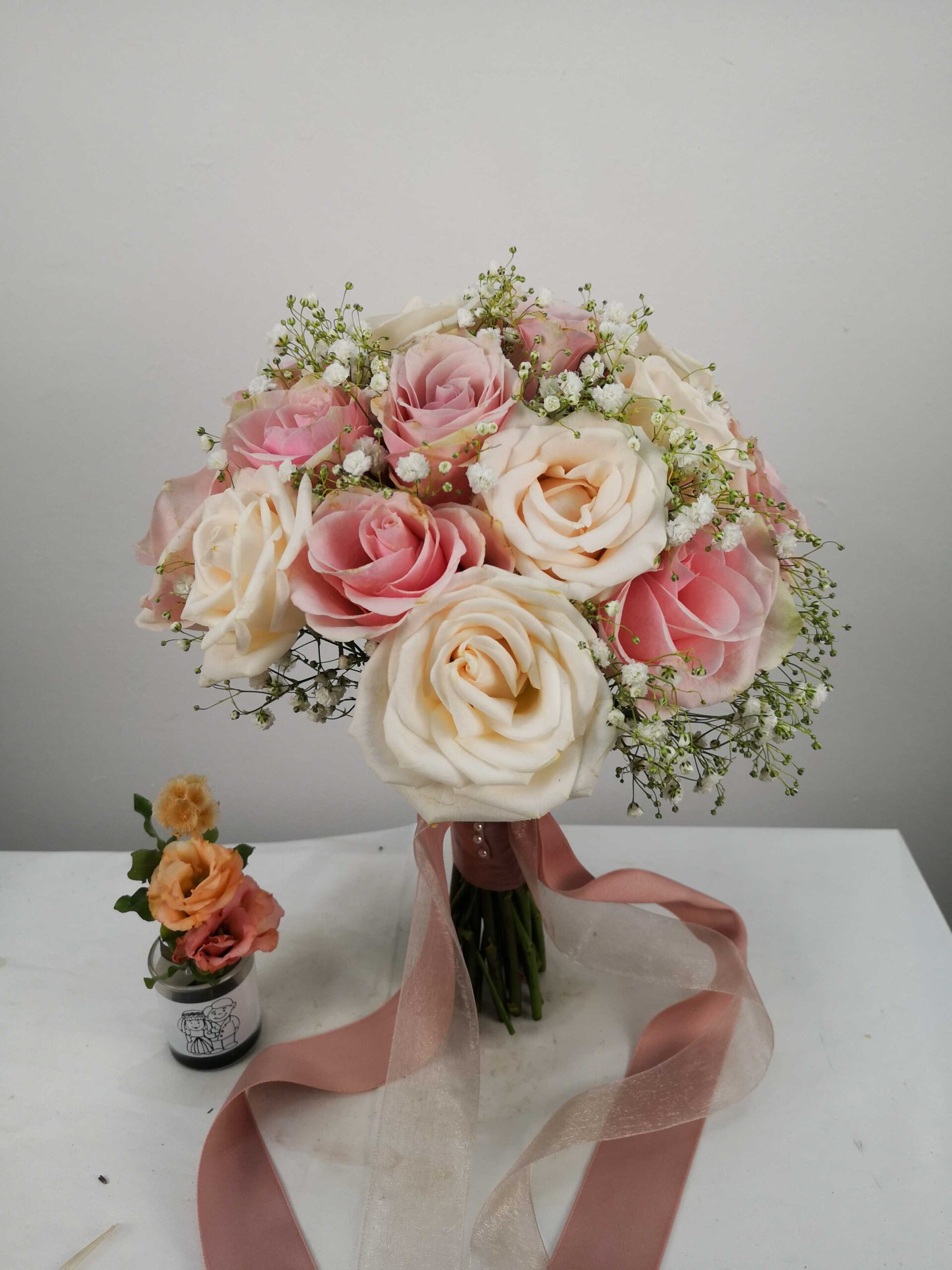 Experience timeless romance with ‘The Enchanted Blossom Bouquet’, your captivating wedding arrangement crafted for brides in Singapore. This exquisite bridal bouquet showcases a stunning array of delicate pink and peach roses, beautifully complemented by ethereal baby’s breath and lush, enhancing greenery. Radiating pure elegance and sophisticated charm, this romantic rose bouquet is the ideal choice for any bride seeking a classic, timeless design. Perfect for your special day, we offer bespoke wedding flower delivery across Singapore to add grace and natural allure to your celebration.