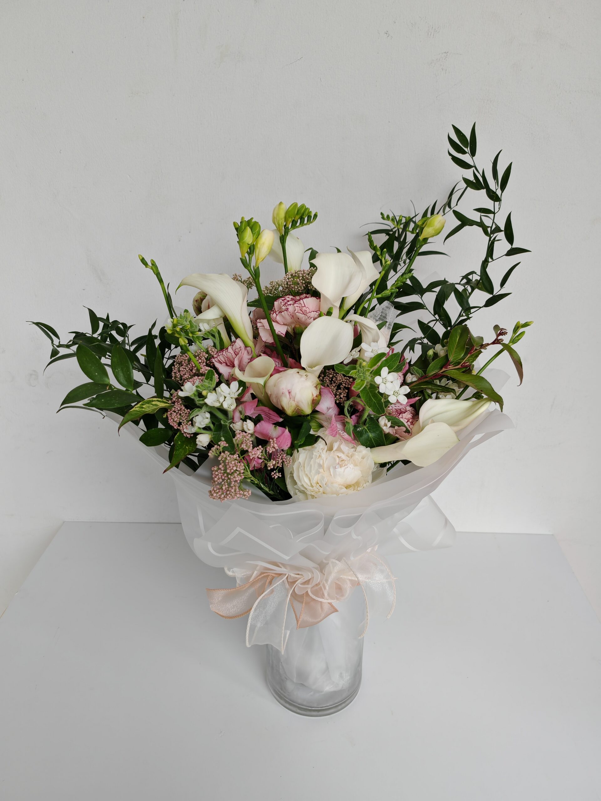 This charming bouquet combines the simple, clean lines of white calla lilies with the gentle, ruffled beauty of pink peonies. Wrapped in a soft, translucent paper with a ribbon, it creates an ethereal and romantic look.